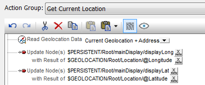 In our app, the coordinates are read by an Action Group and variables defined as persistent data are updated with the longitude and latitude values.