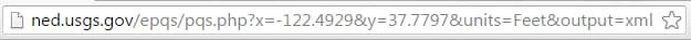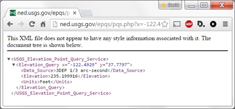 First, we can try out the Web service in a Web browser at the URL http://ned.usgs.gov/epqs