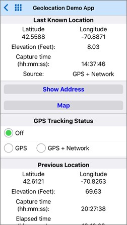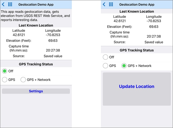 The image below shows the main display of the completed app. In the screen on the left, the app has just been launched and is waiting for the user to enable GPS tracking by clicking one of the radio buttons. On the right, the GPS is turned on and the Update Location button is displayed. The user clicks this button to capture a coordinate pair, and the app executes the REST request to get the corresponding elevation.