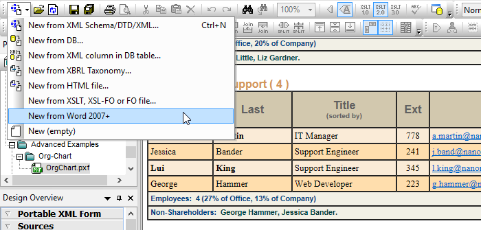 When you begin a new design in StyleVision, you can start it based on a back-end data source, for example XML, XBRL, or a relational database, or you can start it based on an existing Word document and then (optionally) connect those data sources later.