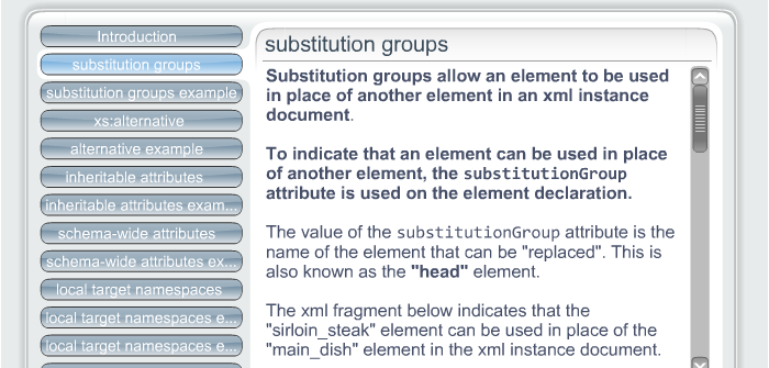 There’s a comprehensive explanation of the new and enhanced features in XML Schema 1.1 in our free, online XML Schema training course, which you can access at any time and complete at your own pace. If you’re an experienced schema developer and simply want to learn about what’s new and enhanced in XSD 1.1, skip ahead to Chapter 9. This course is a great way to learn about XML Schema 1.1 and quickly adapt your schemas to take advantage of the new features.