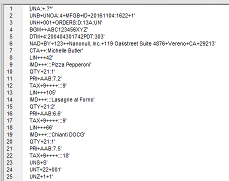 The syntax of EDI files uses three-letter codes and special characters to create highly-structured messages. Shown below is an EDI message to order lunch from a pizza restaurant: