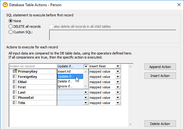 Simply click the Action icon next to the target database table, which is the Person table in the example above, to open the MapForce Database Table Actions dialog. The screenshot below illustrates the dropdown feature that lets you change the SQL Insert statement to Update-If.