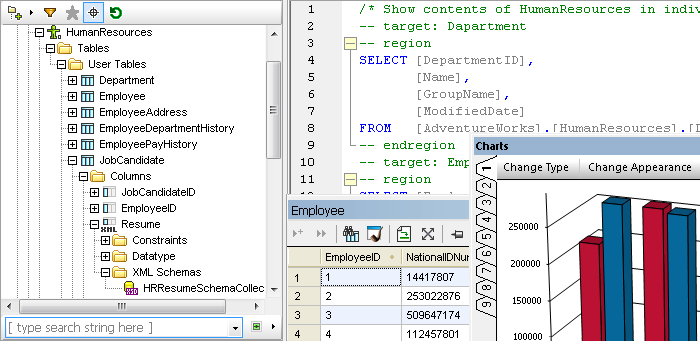 DatabaseSpy browser, SQL Editor, query results, and charting windows