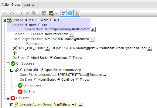 The Actions Dialog in the MobileTogether Designer lets developers define a Print To action to generate PDF, Word, or RTF documents from a mobile app. Once a document is rendered, it is saved on the mobile client for further processing. For instance, a PDF file could be emailed as a file attachment.