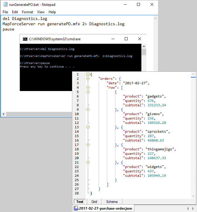 MapForce Server can be executed from a command line in a standalone configuration, under the management of FlowForce Server, or programmatically via an API. In the screenshot below illustrating our MapForce Server use case, MapForce Server is run from a command line in a batch file for testing and QA purposes.