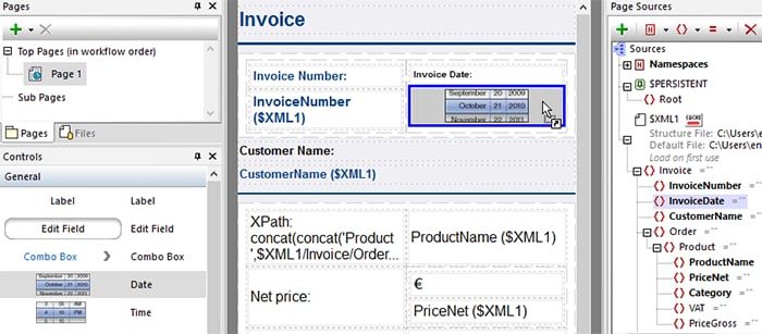 Let’s make a few quick changes to update the date entry-field to a date picker. I can simply drag the Date control from the Controls pane onto the Invoice Date section of the design, and drag and drop again to associate the InvoiceDate XML element with that control.