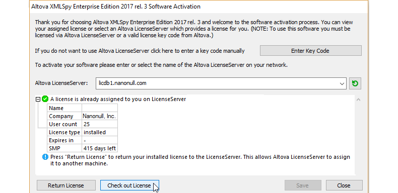 Another benefit of using Altova LicenseServer for the IT administrator is that the end-users can no longer see the actual license key-codes on their developer workstations. Only the administrator can see and manage those key-codes on the administrator web interface. This helps to prevent users from "sharing" license key-codes with their friends and significantly reduces the number of compliance issues with respect to software license management.