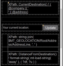 Looking at the Delivery page in the Designer, we can see the destination, current location, and distance to destination are all derived from XPath expressions: