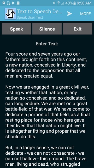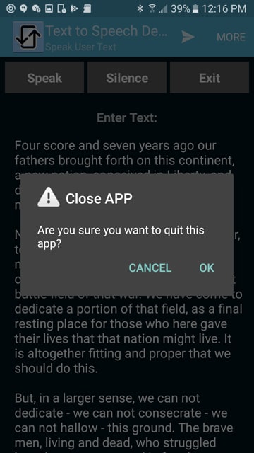 We assigned Text to Speech action directly to the actions for the Speak button, but it can also be used in an action group. We used an action group for the Exit button. When the user clicks Exit, we want to both display message box and speak the message, as seen here on an Android phone: