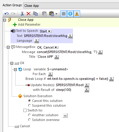 The phrase “Are you sure you want to quit this app” is stored in the data tree and used in XPath expressions for the Text to Speech highlighted action and the MessageBox below it.