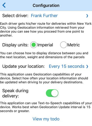 First, we can add a new user setting on the Configuration page with a switch control to enable or disable text-to-speech. Here is the revised Configuration page running on an iPhone: