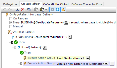 All we have left to do is place the Vocalize New Distance action group in OnPageRefresh actions for the Delivery Page: