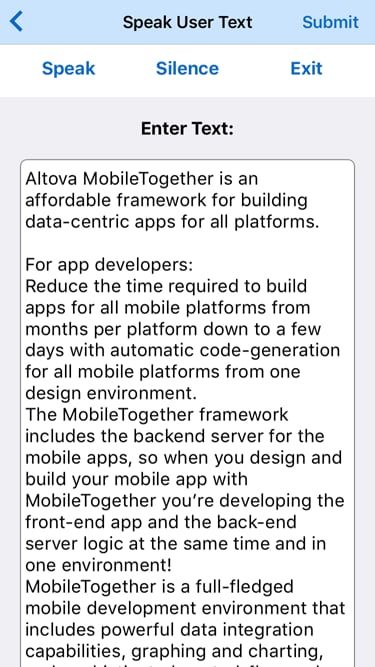 Altova MobileTogether supports text-to-speech functionality for cross-platform mobile apps, empowering developers to add speech and build a rich multi-media user experience.