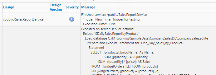 The timer triggers execution and the Server Log view indicates success. The Finished service entry at the top indicates success and the entry immediately below traces execution in step-by-step detail, beginning with the database query.