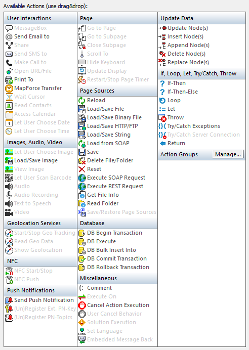 Note that all MobileTogether actions related to page navigation, user interface, or user functionality are grayed out to indicate they are not available for services on backend servers for mobile apps.