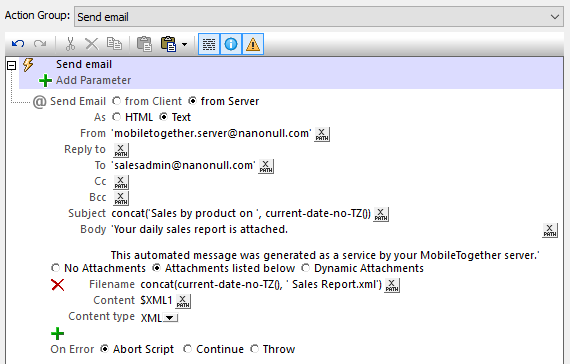 Let’s create a service that queries a sales database to retrieve the count of products sold in a day, converts the query results to structured XML data, sends an email to the sales administrator with the XML data attached as a file, and sends a notification to selected company executives. We’ll use the sales database included with the MobileTogether CompanySales demo app that is installed automatically with the MobileTogether Designer and deployed on the MobileTogether Demo Server.