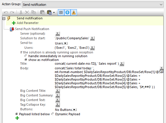 The notification action also allows us to send a data payload to a MobileTogether solution. The CompanySales app runs its own series of queries against the sales database, so we don't need a payload for this notification.