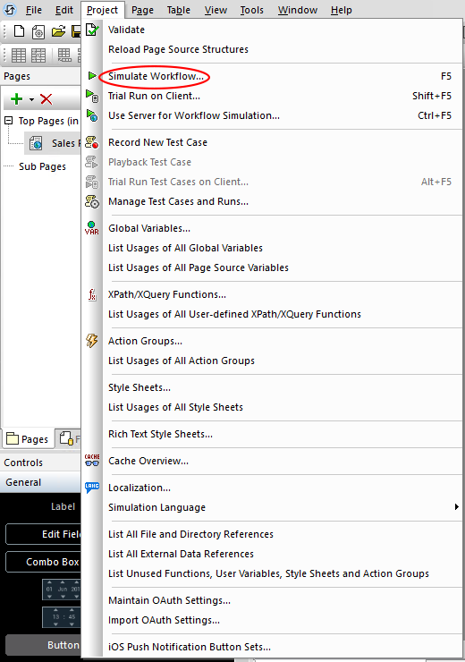 Step 4 - Before deploying the solution to the server, try out the solution first, using the built-in Simulator feature in MobileTogether Designer. Click on the "Project" tab and then select "Simulate Workflow".