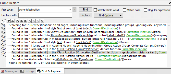 To make developing and refactoring complex apps easier, MobileTogether now has a helpful Find & Replace Pane for searching for and/or replacing strings in XPath expressions, functions, and action groups across a design.