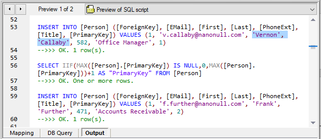 When we execute the SQL script the preview window shows the result of each SQL command. We highlighted one name for emphasis in the screenshots below.