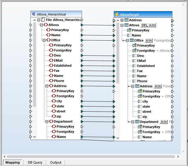 The MapForce Examples folder includes a mapping called Altova_Hierarchical_DB that maps hierarchical data from an XML document to tables in a database.