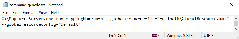 The testing team uses the MapForce Server command line interface to execute the mapping in the desired configuration. Shown here is the generic form of the MapForce Server command line with the mapping name, and parameters for Global Resource file and Global Resource configuration: