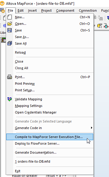 The developer compiles the mapping to a MapForce Server execution file from the MapForce File menu:
