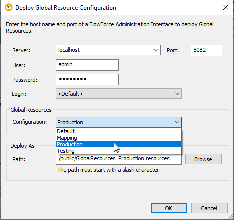 The MapForce Server execution file contains the mapping and the Global Resources file and database references associated with the mapping but does not resolve any particular Global Resources configuration. This allows the Global Resources configuration to be selected at runtime. The Global Resources definitions are stored in an XML file named GlobalResources.xml on the mapping designer’s workstation. The designer would provide both the MapForce Server execution file and the Global Resources file for the testing phase.