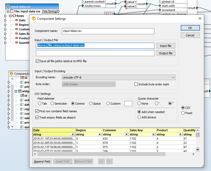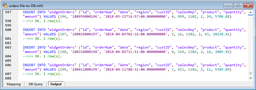 The data mapping project shown below mapping takes a CSV file containing one or more simple sales orders as input. Each order contains a product number and quantity and the mapping calculates the total sale amount based on the current product price, generates a unique order number, and inserts the order into an existing database.