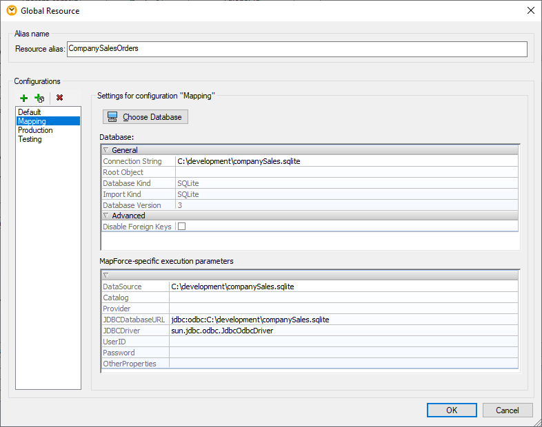 Global References can also be organized into configurations. For instance, some data mapping projects require separate configurations for mapping design, testing, and production. Switching between configurations changes both the source data file and the target database.