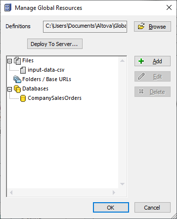 Global Resources are portable references to files, folders, or databases that work as aliases. When stored as Global Resources, paths and database connection details become reusable and available across multiple Altova applications. The image below shows Global Resources that reference an input data file and a database.