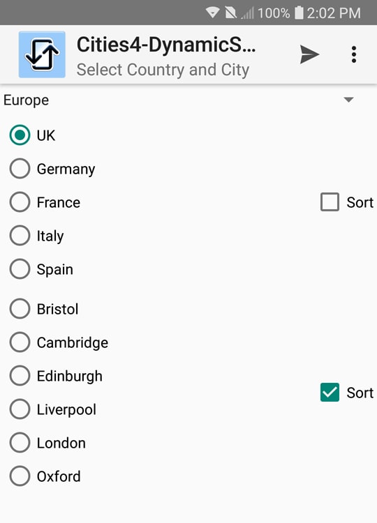 The MobileTogether Designer includes several example projects demonstrating Control Templates. We’ll describe the Cities4-DynamicSelection app. The screenshot below shows a partial view of the app running on an Android phone: