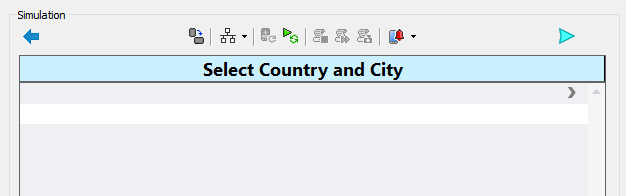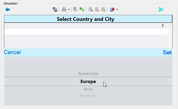 The Simulation window now shows the appropriate country list for Europe, but no city names are listed: