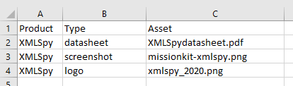 We can enforce a list of asset types by importing the CSV file into XMLSpy and generating an XML Schema where the Type element is selected from a defined list. Then an inexperienced marketing intern can create a list of assets in XMLSpy Grid view. The Type field is enforced: