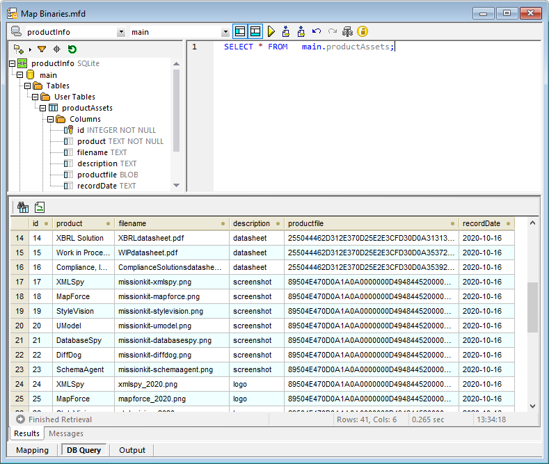 Altova MapForce, the award-winning, graphical data mapping tool for any-to-any conversion and integration, includes features for effortlessly data mapping binary objects to or from all popular relational databases. Data such as images, PDF files, video files, or any other binary data can be mapped. Let’s look at an example.