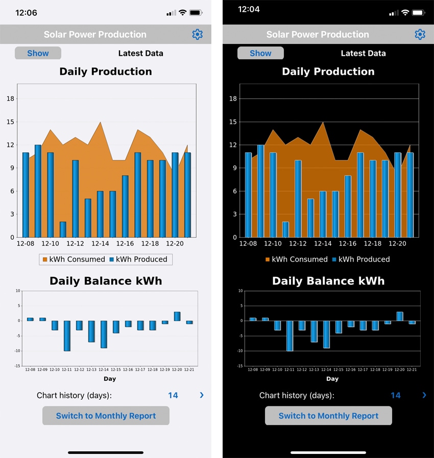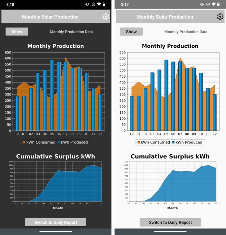 This app lets users record solar panel production and electricity consumption from meter readings and produces charts to illustrate the data and track the surplus over time.