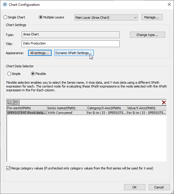 We set other elements like grid lines for each axis in the Creation Settings dialogs to be a light gray shade that works for either theme. There’s a separate Dynamic XPath Settings dialog for each layer of each chart, but once they are all edited, that’s it. The charts will automatically be created correctly for Light Theme and Dark Theme.