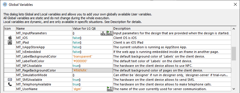 MobileTogether includes global variables that let developers detect user device settings at runtime and program appropriate actions based on device functionality. The MobileTogether Designer Global Variables dialog lists all the global variables and their values for the selected simulation device.