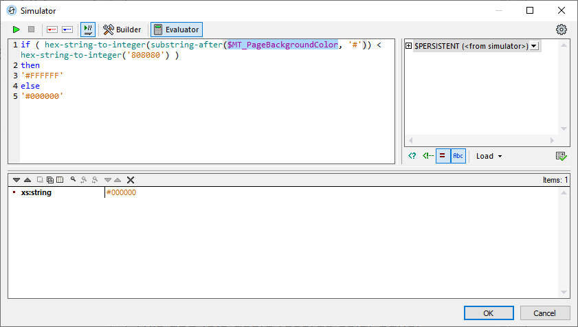 This expression converts the hex string to an integer, compares it to the value for 50% gray, and selects the string value for black or white based on the result. This is a good expression to automatically select a text color for Light Theme or Dark Theme, so let’s apply it in a user function: