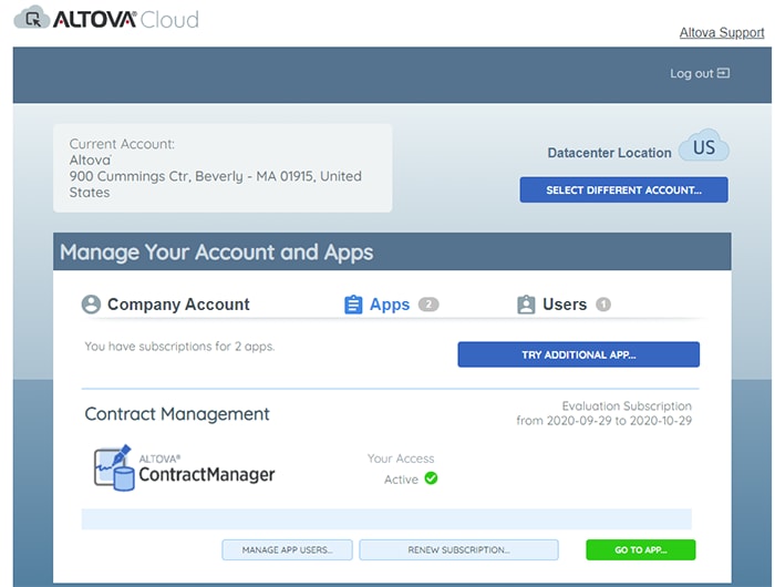 It’s easy to try ContractManager to get a feel for how it works. Simply create an account in the Altova Cloud and start a free, 30-day trial. You won’t have to enter a credit card, our salespeople will not contact you, and it only takes about a minute to get started.