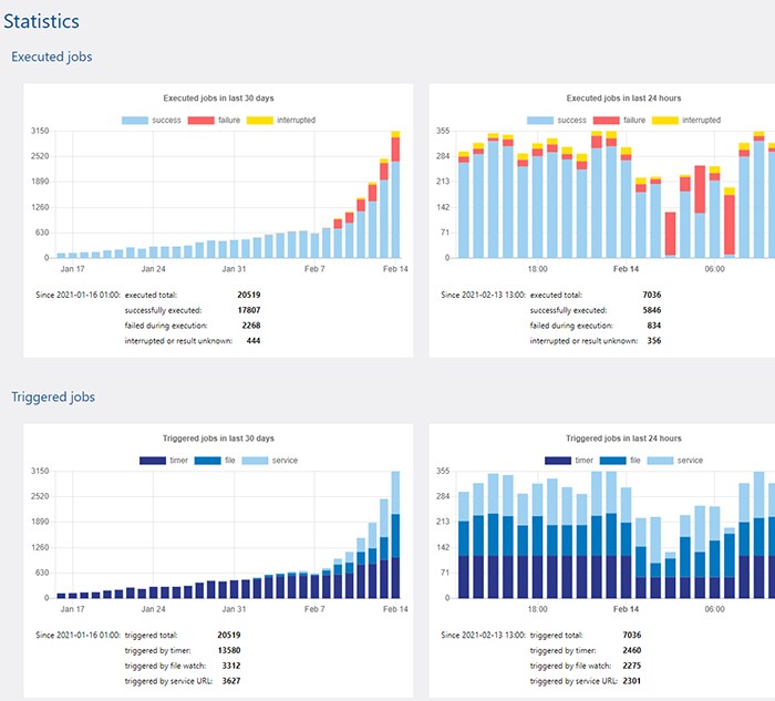 FlowForce Server includes a helpful web interface for managing all aspects of workflow automation. Adding to detailed logging of FlowForce Server jobs, a new visual dashboard offers charts and statistics that help administrators monitor the progress of FlowForce Server jobs, as well as performance of the server itself, in great detail.