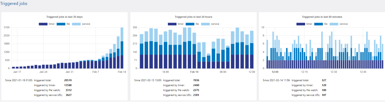 - See how many jobs were started via service URL and via time or file triggers