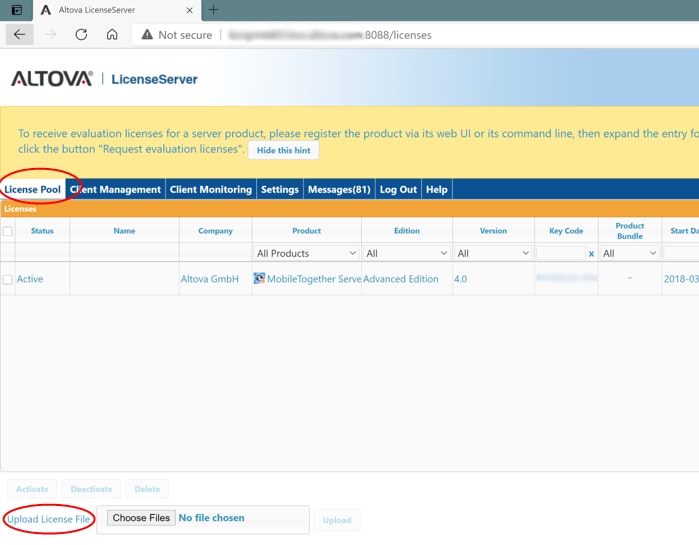You can verify that license change on the license server is congruent with the MobileTogether Server software. To verify this, from the machine running MobileTogether Server, log onto the MobileTogether Server or bring up its administration portal from a web browser, just like we did for the license server: