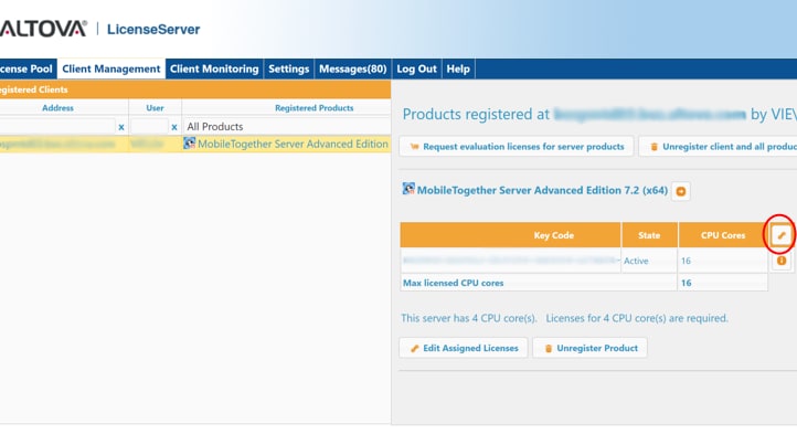 To do this, go to the Client Management tab and choose the MobileTogether Server (for our example there is only one server) whose license is expiring. I click on the Link icon to edit the assigned license.