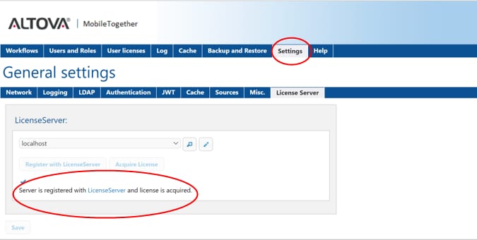 Select the “Settings” tab and scroll to the bottom of the page to review the LicenseServer Host for the registration status and to verify if the license is acquired or not.