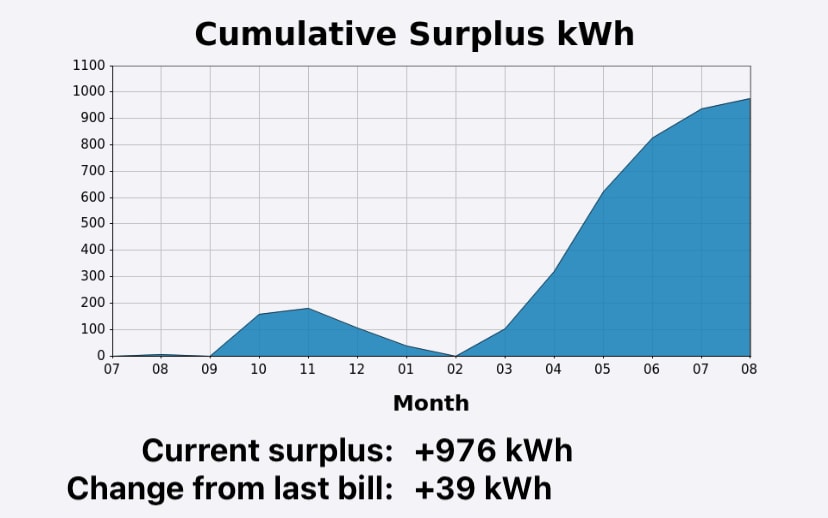 Despite Casey’s unexpected result, the Cumulative Surplus graph validates the net-zero billing concept for rooftop solar generation. Casey is entering the seasons of less daylight and more electricity consumption with a bank of produced kilowatt hours to draw down.