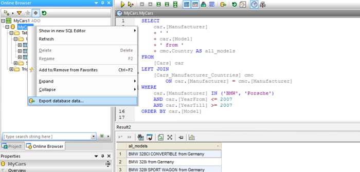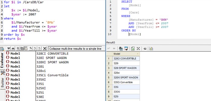 MobileTogether includes a sample mobile app called MyCar that is a great basis for an XQuery tutorial. This app demonstrates how to query a user about his or her dream car. The data is provided by a set of parameters defined within a database; it was ideal to work with as it contained many records which each had several data points. The dataset itself is provided as an MDB file which I opened with DatabaseSpy and exported to XML. I modified the exported file, changing a few of the fields to improve the readability of the queries I would produce.