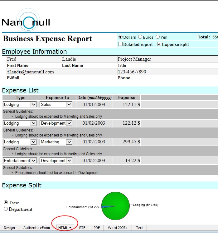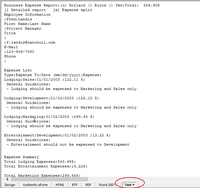 A single design generates output in HTML, RTF, PDF, Word, and an Authentic e-Form. You can also generate the same report in pure text (without style and layout formatting) by clicking the Text output tab.