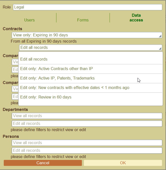 The Data access tab in the Roles dialog allow you to further refine viewing and editing rights on for each role using predefined filters designated on each data container.